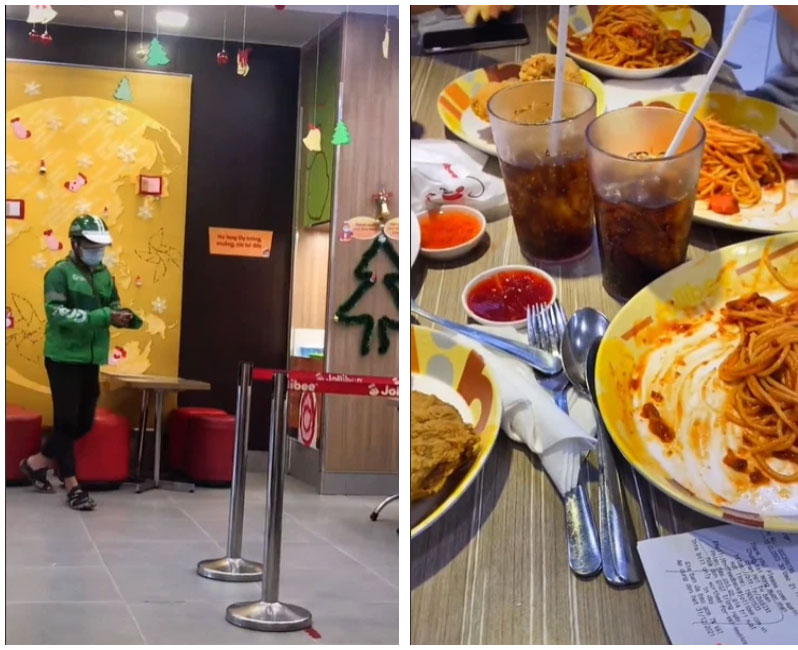 Khi vào quán thì anh gọi một phần burger để kiếm chỗ ngồi. Đợi grab lấy đồ xong, anh chàng vào quán mượn đĩa để đổ ra ăn.