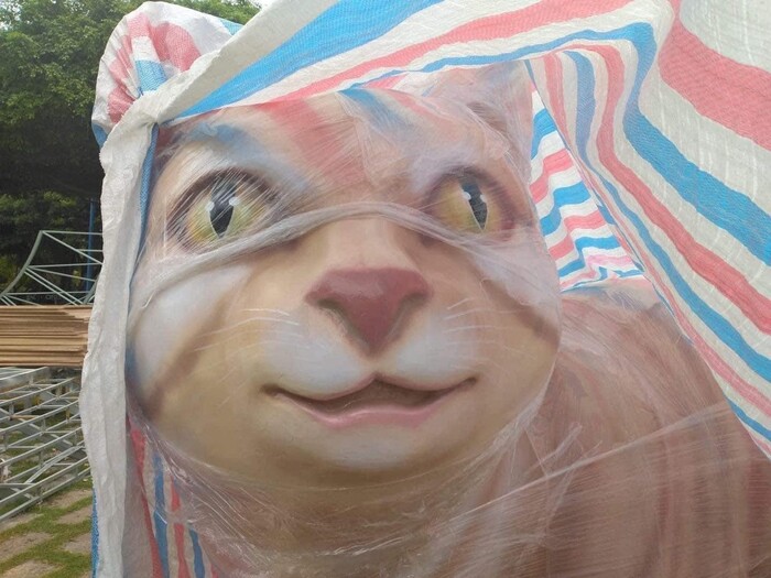 Các linh vật mèo được đặt chung với mèo máy Doraemon khổng lồ.
