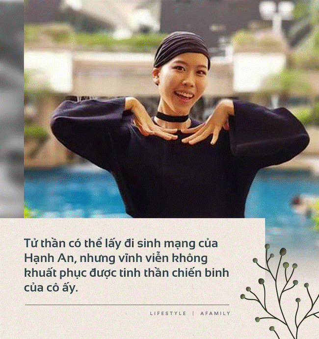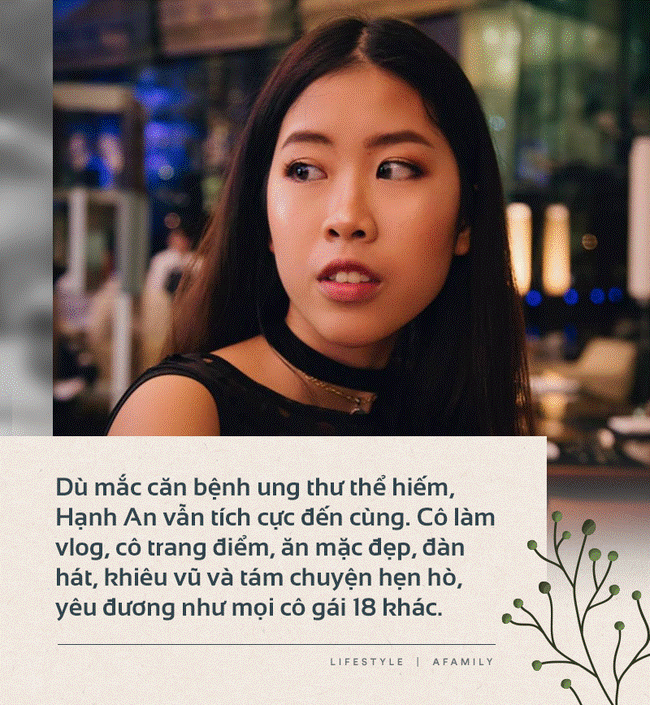 Trong suốt 2 năm qua, kể từ ngày nhận “án tử” bằng căn bệnh ung thư thể hiếm gặp với tỷ lệ sống sót chỉ 10 - 20%, Hạnh An khóc đúng hai lần. Đó đều là hai lần quá đau đớn do hóa trị và phẫu thuật. Cô gái vừa tròn 18, tốt nghiệp một trường quốc tế, xinh đẹp, quyến rũ, hát hay, đàn giỏi, khả năng hội họa bẩm sinh, là thủ lĩnh của nhiều phong trào xã hội trong giới học sinh Hà Nội, có một gia đình êm ấm, 1 người cha nổi tiếng và hoàn hảo, bỗng dưng bỏ lửng cuộc đời trong dấu “ba chấm”. Đã có rất nhiều người không vượt qua được cú sốc trớ trêu ấy trong 1 tháng. Còn Hạnh An, tất cả những gì viên mãn mà cô may mắn có được trong 18 năm trước đó lại trở thành động lực, thành niềm tin mạnh mẽ để cô chọn đương đầu thay vì buông xuôi.