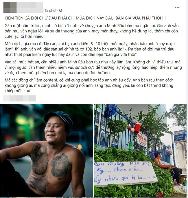 Những giờ qua, trên mạng xã hội cũng xôn xao lan truyền thông tin, hình ảnh về "anh Minh bán rau ngầu lòi". Mặc dù đây không phải là lần đầu tiên ông chủ sạp rau "gây sốt", nhưng đáng nói, lần này, anh Minh không chỉ "hạ gục" trái tim nhiều người, đặc biệt là dân lao động còn khó khăn, bởi những câu rao hàng dù sai chính tả nhưng đầy độc đáo, sáng tạo mà còn bởi tấm lòng thiện tâm, sẵn sàng từ bỏ "cái lợi trước mắt" vì tình yêu thương cộng đồng.