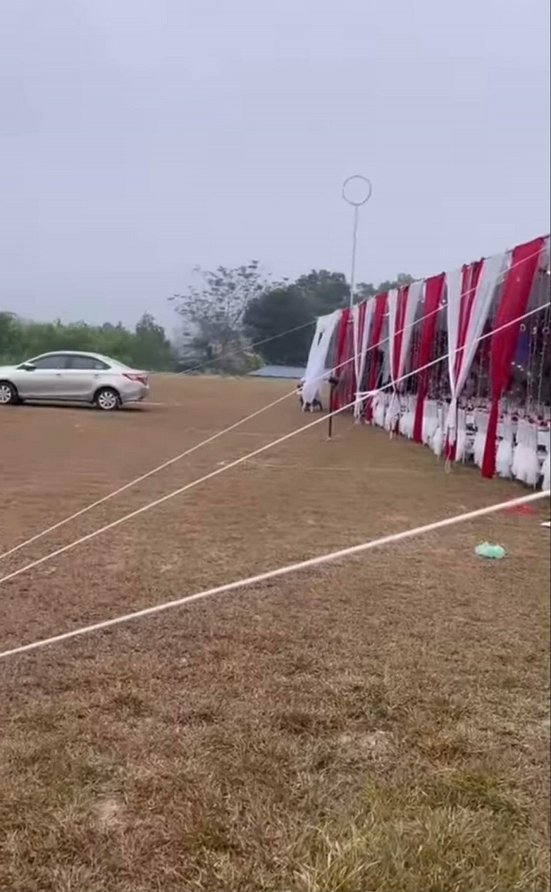 Theo đó, nhiều dây căng rạp đám cưới được buộc vào 2 chiếc ô tô tiền tỉ. Trong đó, các sợi dây được buộc vào phía đuôi xe hoặc bánh xe ô tô. Thậm chí, “kỹ sư dựng rạp” này còn tuyên bố hài hước “cọc rẻ ý mà”.