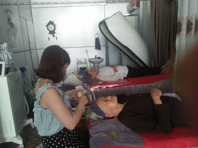 Hình ảnh 2 cụ bà đang được thực hiện 12 bước chăm sóc da.