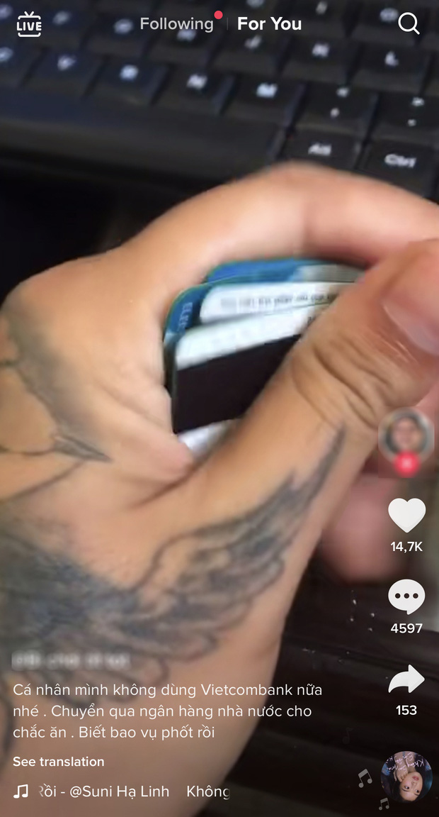 Không chỉ dừng lại ở việc tấn công fanpage chính thức, hùa nhau đánh giá 1 sao trên app, mới đây còn một hình thức khác "tẩy chay" nhằm vào Vietcombank. Cụ thể, dân tình đang lan truyền clip TikTok của một nam thanh niên. Trong đó, nam thanh niên này đã quay lại trực tiếp cảnh bản thân tự tay bẽ gập 2 chiếc thẻ visa do Vietcombank phát hành.
