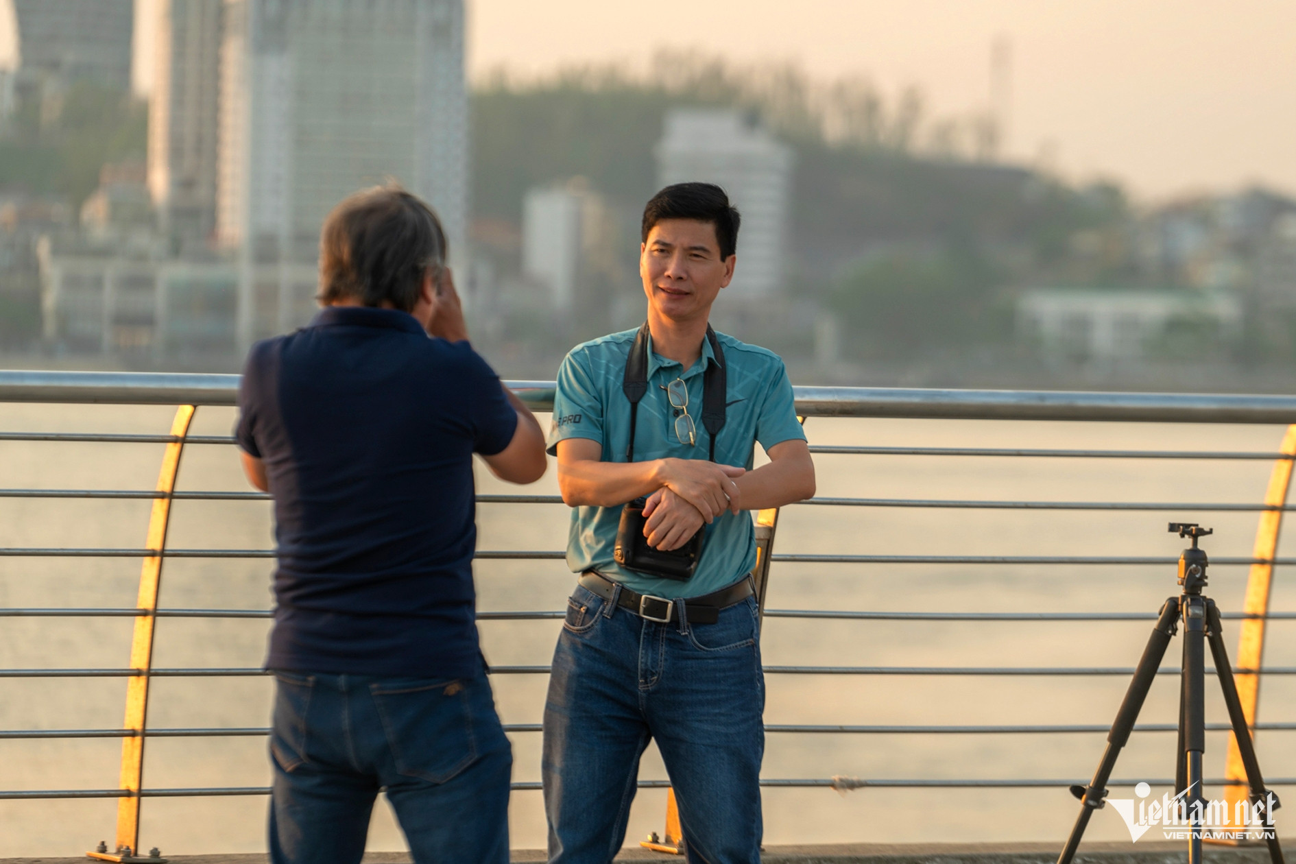 Từ các bạn trẻ cho đến người lớn tuổi đều thích thú ghi lại những bức ảnh chụp cùng hoàng hôn. Ảnh: Phạm Công