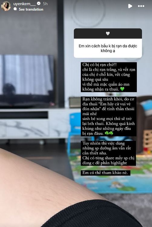 "Chị có bị rạn chứ. Chị rạn trắng và vết rạn của chị ở chỗ kín, vết cũng không quá sâu vì thế mà mặc quần áo mọi người không nhận ra thôi. Rạn không tránh khỏi, do cơ địa thôi. Em hãu cứ vui vẻ đón nhận để tinh thần thoái mái nhé. Sinh bé xong mọi thứ sẽ trở lại bình thường thôi. Không quá kinh khủng như ngày đầu bị rạn đâu", Tố Uyên chia sẻ tích cực.