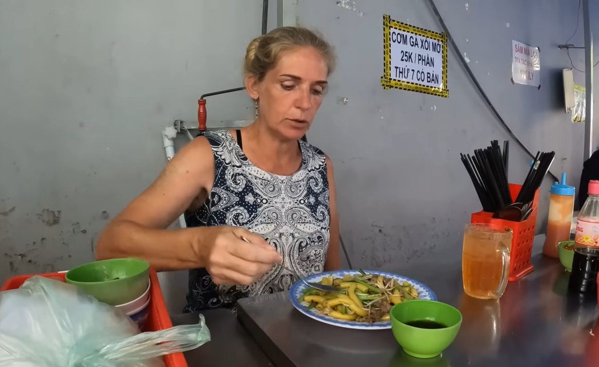 Bữa trưa, Anna quyết định nếm thử món gỏi cuốn tai heo với giá 7.000 đồng/chiếc. Nữ du khách mua 3 chiếc và cho rằng bản thân đã có tuổi, sức ăn kém hơn nên thấy suất ăn như vậy là đủ no.