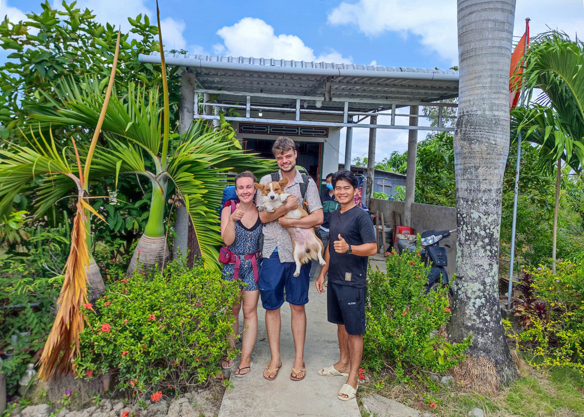Anh Trần Bì (áo đen, bên phải) đón khách Tây tới lưu trú tại homestay miệt vườn của gia đình