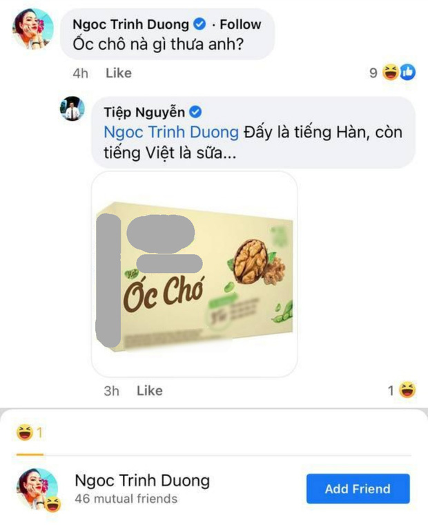 Không dừng lại ở đó, phía dưới status của Trần Ngọc còn có sự xuất hiện của 2 gương mặt khác đến từ VTV là BTV Ngọc Trinh và BTV Tiệp Nguyễn. Khi Ngọc Trinh để lại bình luận hỏi Trần Ngọc "ốc chô" là gì, Tiệp Nguyễn đã nhanh tay trả lời bằng cách đăng ảnh hộp sữa hạt óc chó.