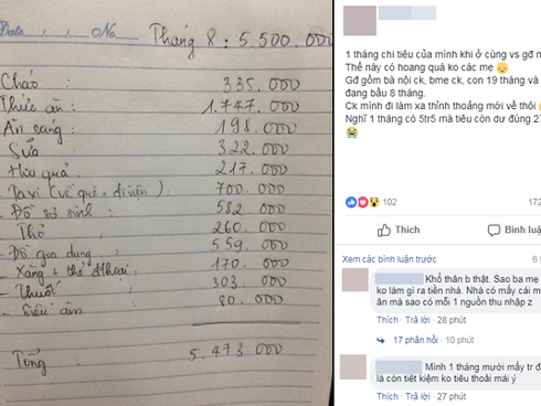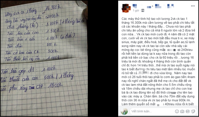 "Các mày thử tính hộ tao với lương 2 vợ chồng tao 1 tháng 16 triệu 300 ngàn mà cầm lương về tao phải chi tiêu tất cả các khoản này mỗi tháng đấy.