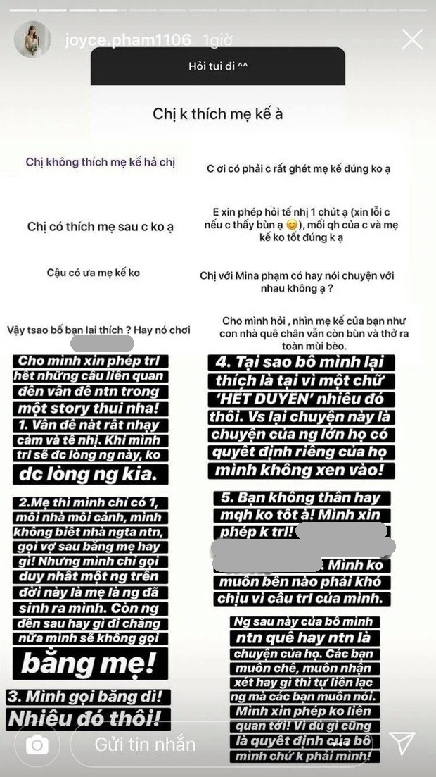 Joyce Phạm từng tuyên bố sẽ không gọi "người đến sau" là mẹ mà chỉ gọi bằng dì