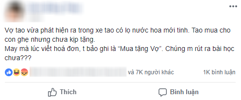 Minh chứng là mới đây, có một anh chàng đã hả hê mừng rỡ chia sẻ khoảnh khắc lừa được vợ mình khi cô ấy phát hiện ra trong xe chồng có một chai nước hoa mới tinh. Chai nước hoa này, ban đầu được anh chàng mua với mục đích tặng bồ nhí: "Vợ mình vừa phát hiện ra trong xe mình có lọ nước hoa mới tinh. Mình mua cho "con ghẹ" nhưng chưa kịp tặng. May mà lúc viết hoá đơn, mình bảo ghi là "Mua tặng Vợ". Các bạn rút ra bài học chưa?".