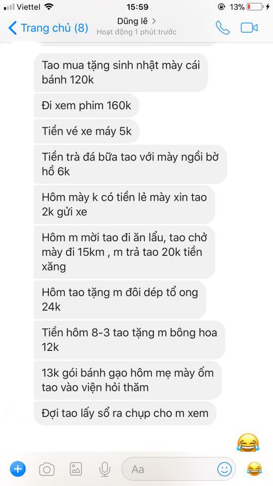 Đoạn tin nhắn đòi nợ từ cốc trà đá cho tới vé gửi xe của người yêu cũ.