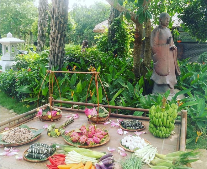Ở một số vùng miền, đôi khi mâm cúng rằm tháng 7 của họ chỉ gồm những thực phẩm, món ăn truyền thống thuần chay tại địa phương. Người dân có hoa sen dâng lễ, hoa quả theo mùa, bánh tét, mâm 5 loại rau củ quả và buồng chuối đẹp để thắp hương. Ảnh: Njassica.
