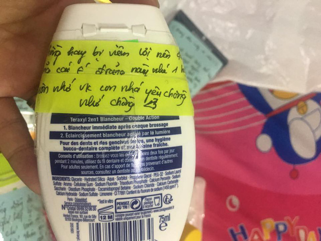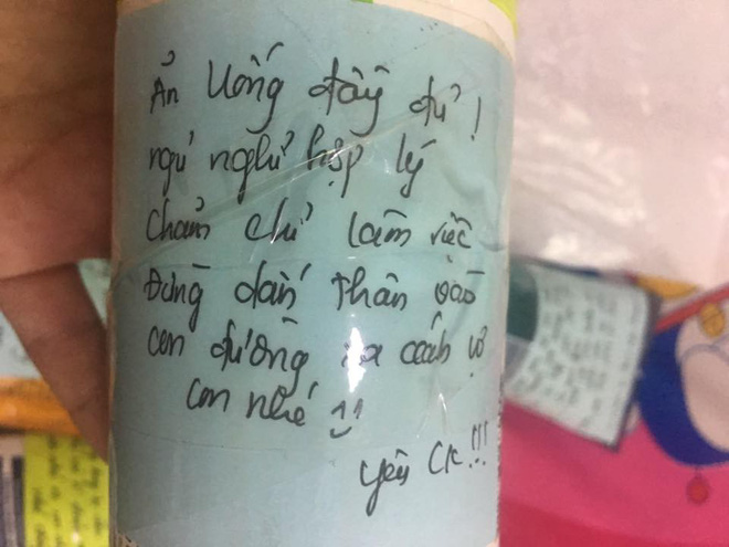 Qua bức ảnh có thể thấy người vợ này đã rất cẩn thận và chu đáo khi dán miếng giấy nhớ lên từng món đồ dặn chồng, khi nào thì dùng cái này, khi nào thì dùng cái kia. Kèm theo đó là những lời yêu thương có cánh, thầm ''nhắc nhở'' chồng đi xa nhưng đừng bao giờ nhẹ dạ, quên lãng vợ con. Đồng thời, cô nàng cũng hy vọng rằng, dù xa chồng nhưng vẫn luôn mong chồng lúc nào cũng cảm nhận được bóng dáng của vợ gần bên...