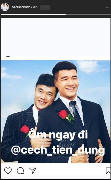 Sau màn "cưa cẩm" của thủ môn điển trai, sự ý chú của người hâm mộ tiếp đổ dồn sang Đức Chinh và chờ đợi phản ứng của anh. Không hổ danh "thánh lầy", tiền đạo họ Hà đăng một bức ảnh cưới đẹp không thua kém Tiến Dũng. "Ôm ngay đi", dòng chữ ngắn gọn của Đức Chinh thay cho lời đồng ý.