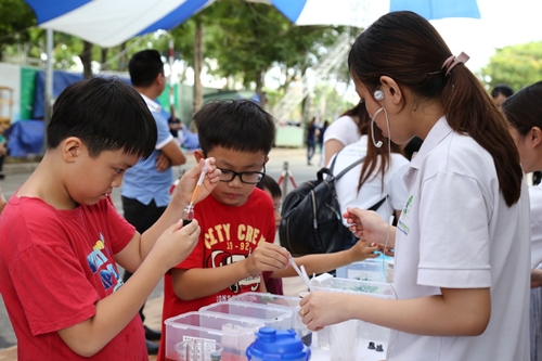 Các bé hào hứng trước một thí nghiệm khoa học kỳ thú tại lễ hội diễn ra ngày 2/8