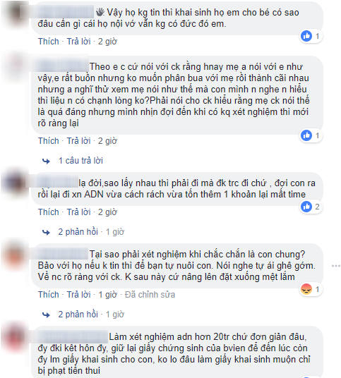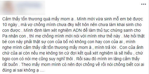 Mẹ trẻ viết: "Cảm thấy tổn thương quá mấy mom ạ. Mình mới vừa sinh mổ em bé được 10 ngày, mà vợ chồng mình chưa đăng ký kết hôn nên chưa làm khai sinh cho con được. Mình định làm xét nghiệm ADN để làm thủ tục chứng sanh cho anh nhận con, thì mẹ chồng mình mới nói với mình như thế này: "Mẹ hỏi thật, bé con này phải thật sự con của bố nó không con hay con của ai?".