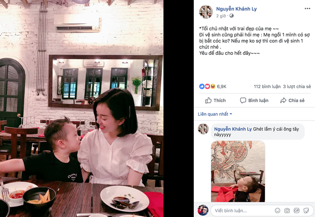 "Tối chủ nhật với trai đẹp của mẹ. Đi vệ sinh cũng phải hỏi mẹ: 'Mẹ ngồi 1 mình có sợ bị bắt cóc không? Nếu mẹ không sợ thì con đi vệ sinh 1 chút nhé'. Yêu để đâu cho hết đây" - Ly Kute viết.