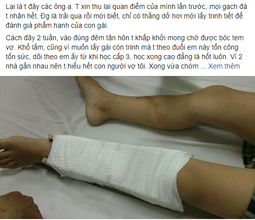 "Lại là tôi đây các ông ạ. Tôi xin thu lại quan điểm của mình lần trước, mọi 'gạch đá' tôi nhận hết. Đúng là trải qua rồi mới biết, chỉ có thằng dở hơi mới lấy trinh tiết để đánh giá phẩm hạnh của con gái.