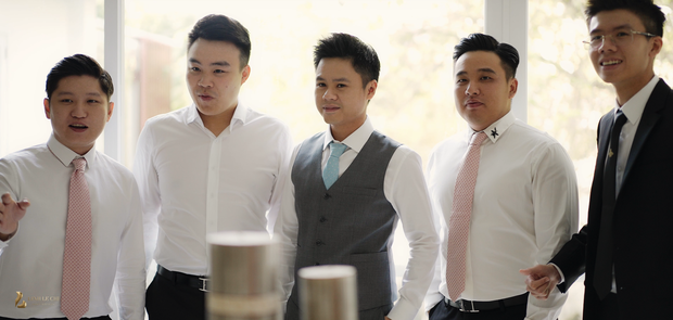Dàn phù rể, bên phải ngoài cùng là thiếu gia độc thân còn lại của nhà Saigon Square