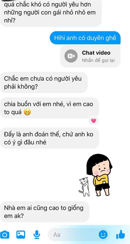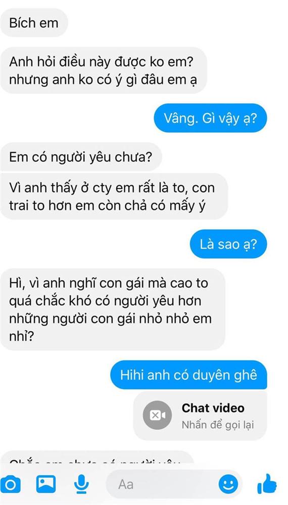 Đến đoạn này thì nhiều người cứ tưởng mười mươi là anh chàng chuẩn bị "thả thính", tán tỉnh đồng nghiệp, chuẩn bị tỏ tình đây mà. Ấy nhưng không, anh chàng bắt đầu để lộ sự kém duyên của mình: "Vì anh thấy ở công ty em rất là to, con trai to hơn em còn chả có mấy ý. Anh nghĩ con gái mà to cao quá chắc khó có người yêu hơn mấy cô nhỏ nhỏ em nhỉ".