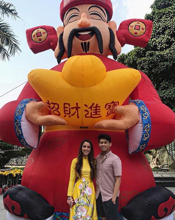 Dù là gái Tây, nhưng bạn gái Hiếu Nguyễn diện chiếc áo dài truyền thống của Việt Nam cực kỳ tôn dáng, cô buông thả mái tóc dài cho thêm phần nữ tính và chọn lối trang điểm cực nhẹ nhàng.