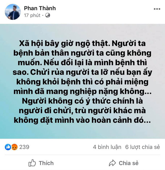 Cụ thể, Phan Thành viết: "Xã hội bây giờ ngộ thật. Người ta bệnh bản thân người ta cũng không muốn. Nếu đổi lại là mình bệnh thì sao". Đáng chú ý, người này còn thẳng thắn phê phán hành vi chỉ trích của cộng đồng mạng: "Chửi rủa người ta lỡ nếu bạn ấy không khỏi bệnh thì có phải miệng mình đã mang nghiệp nặng không… Người không có ý thức chính là người đi chửi, trù người khác mà không đặt mình vào hoàn cảnh đó…".