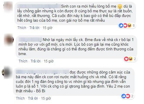 Một thành viên khác bình luận: “Sinh con ra mới hiểu lòng cha mẹ. Nhưng nếu mình là mẹ, mình sẽ không dạy con phải hy sinh một cách như thế. Mình sẽ dạy con sống sao cho thật hạnh phúc”.