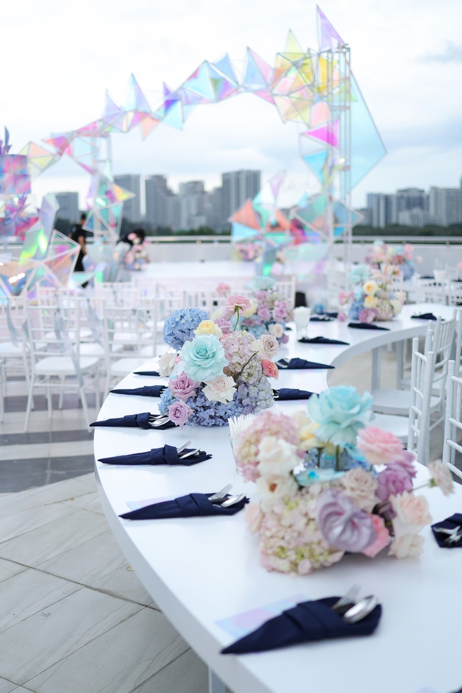Theo những hình ảnh được ghi lại, tiệc cưới của Bomman - Minh Nghi được trang trí theo chủ đề Hologram (phản quang) tông màu chủ đạo xám bạc - hồng - sequin lấp lánh. Vì vậy thay vì hoa tươi ngập tràn như nhiều đám cưới khác, ngày trọng đại của cặp đôi lấy các hình khối mỹ thuật phản quang và màu sắc rực rỡ làm chủ đạo.