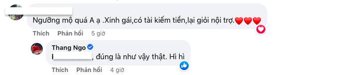 Đồng thời, anh còn thể hiện sự tự hào khi được một cư dân mạng khen: "Ngưỡng mộ quá anh ạ. Xinh gái, có tài kiếm tiền, lại giỏi nội trợ".