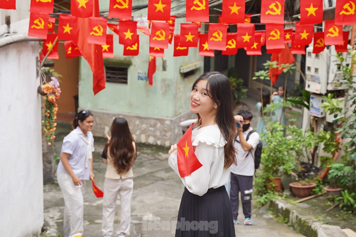 Tại ngõ nhỏ Yên Phụ từ sáng sớm nay (1/9), rất đông người dân và du khách đến để chụp hình với những lá cờ Đảng và Tổ quốc. |
