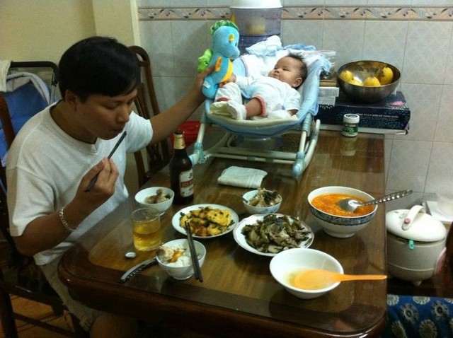 Thông cảm với công việc của vợ, chồng cô không ngại ngần xắn tay giúp vợ việc nhà, rồi chăm sóc con để cô có thể chuyên tâm công tác.