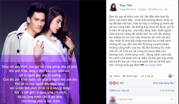 Lưu Thiên Hương tức giận với dòng chia sẻ trên trang cá nhân khi một bộ phận khán giả chỉ trích Công Vinh - Thủy Tiên nặng nề.