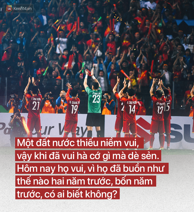 Trên cái sân Panaad heo hút, trên khán đài màu đỏ đông hơn màu trắng, hàng nghìn người hy sinh cuối tuần để sang Philippines cổ vũ, la hét khản cổ, xong trận chả kịp ăn uống lên máy bay đi về để thứ Hai còn đi làm. Mệt mỏi rã rời lên máy bay còn la làng "Việt Nam vô địch". Ở Việt Nam, dân tình đi bão tới khuya. Công nhận có hơi lố thật, nhưng mà lố dễ thương. Một đất nước thiếu niềm vui, vậy khi đã vui hà cớ gì mà dè sẻn. Hôm nay họ vui, vì họ đã buồn như thế nào hai năm trước, bốn năm trước, có ai biết không?