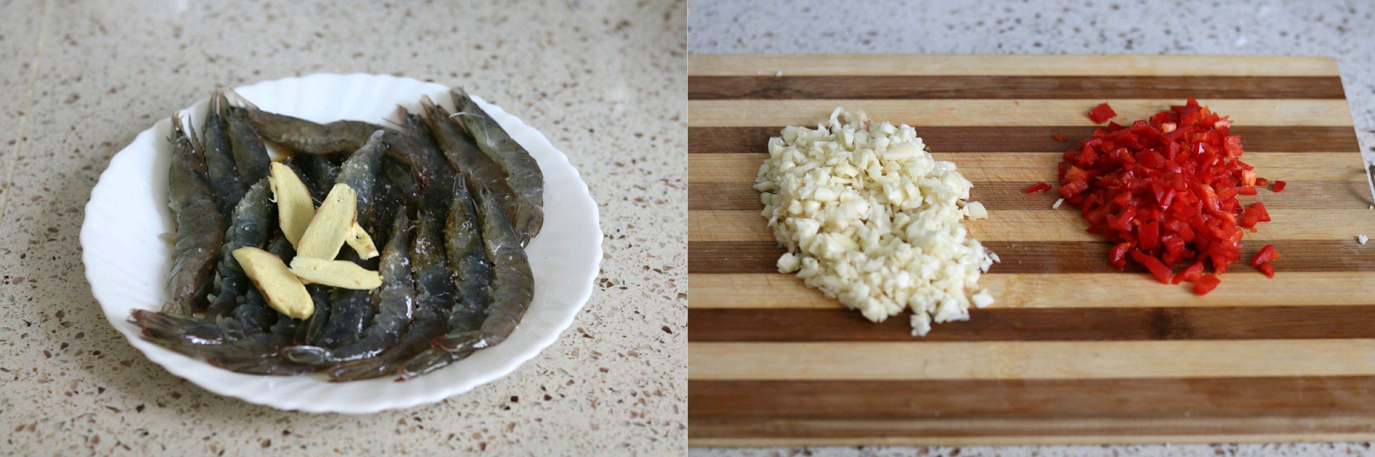 Tôm rửa sạch cắt bỏ càng và chân, dùng dao hoặc kéo rạch một đường ở bụng tôm để khi nướng tôm không bị cong. Cho tôm vào tô, thêm muối, đường, rượu nấu ăn, dầu hào, vài lát gừng rồi trộn đều, ướp tôm 10 phút. Tỏi và ớt băm nhỏ.