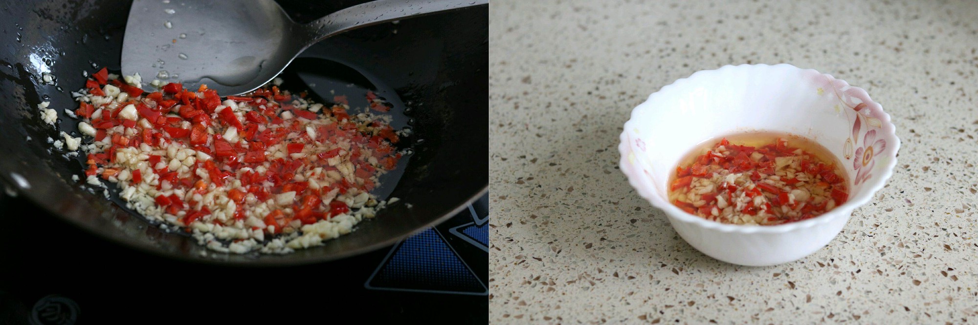 Đổ một ít dầu ăn vào chảo, thêm tỏi và ớt băm vào xào thơm để làm dầu tỏi ớt. Sau khi xào thơm thì đổ dầu tỏi ớt ra bát, thêm muối và trộn đều.