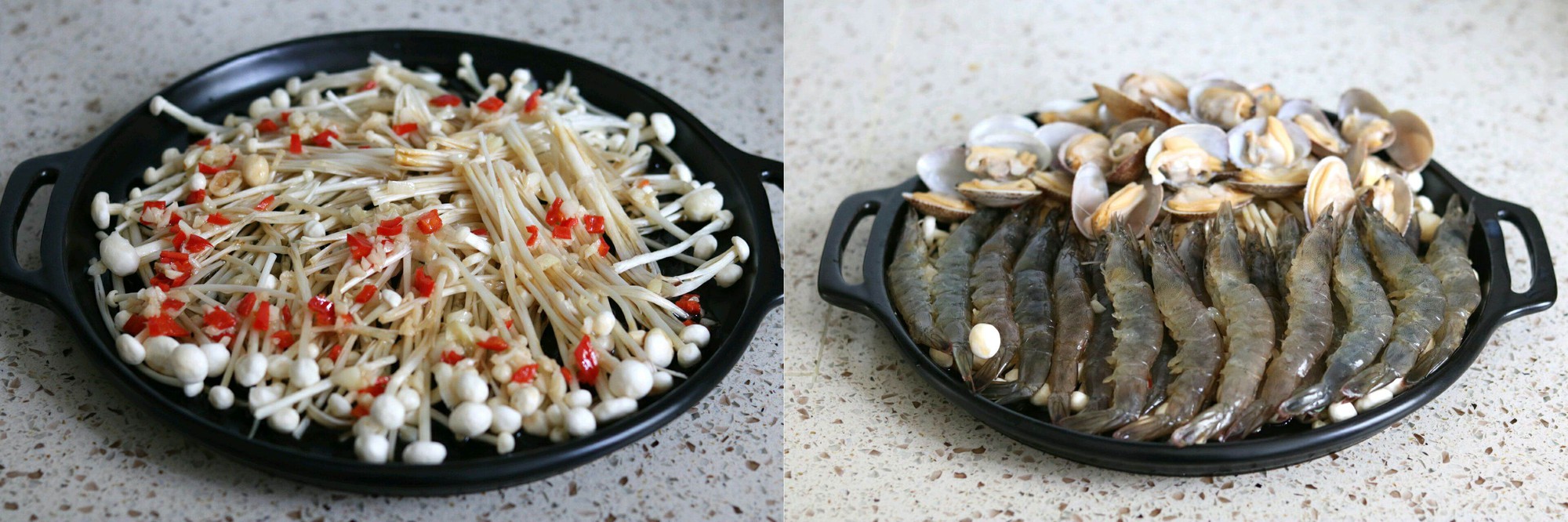Đổ nước sốt trộn tôm và 1 thìa dầu tỏi ớt đều lên trên nấm. Xếp tôm và ngao lên trên.