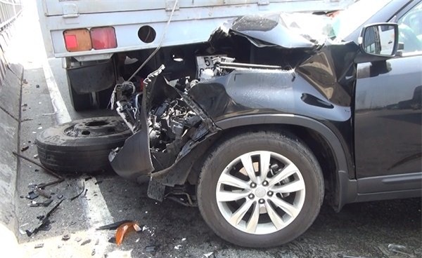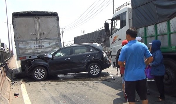 Tại hiện trường, ô tô 7 chỗ kẹp chặt giữa hai xe tải, hư hỏng nặng. Hai túi khí bị bung ra, dầu nhớt chảy lênh láng trên mặt đường. Đôi vợ chồng người đàn ông (ngoài 60 tuổi) mắc kẹt bên trong, khóc thét cầu cứu.