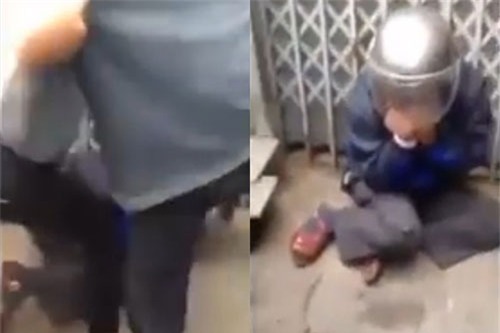 chân đạp không ngừng vào người đàn ông, dùng mũ bảo hiểm giáng vào