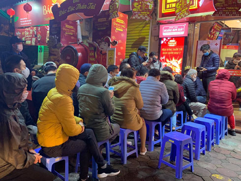 Ghi nhận của PV. VietNamNet trước ngày Vía Thần Tài (mùng 10 tháng Giêng âm lịch), tại các cửa hàng vàng trên phố Trần Nhân Tông (Hai Bà Trưng, Hà Nội), lượng người tới mua vàng tương đối đông, có thời điểm khách đứng chật kín các cửa hàng.