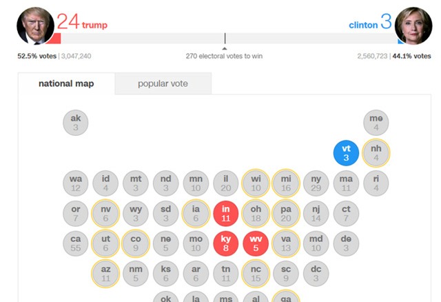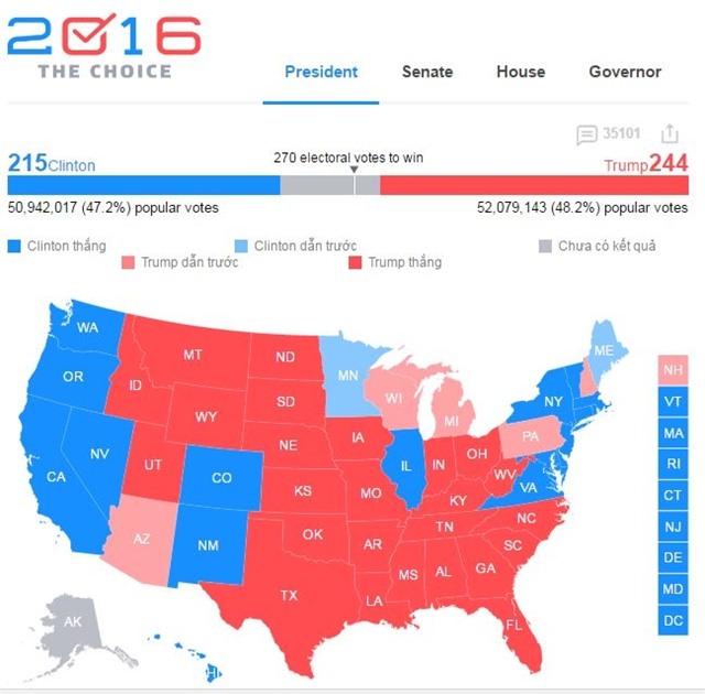 Theo CNN, ông Trump hiện giành 216 phiếu đại cử tri, trong khi số phiếu của bà Clinton hiện là 209 phiếu.