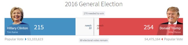 Theo Fox News, ông Trump hiện giành 254 phiếu đại cử tri, trong khi bà Clinton có 215 phiếu.