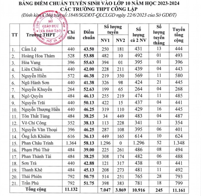 Trong đó, 3 trường có điểm chuẩn cao nhất là trường THPT Phan Châu Trinh 58,13 điểm, trường THPT Hòa Vang 55,63 điểm, trường THPT Hoàng Hoa Thám 53,88 điểm. Trường có điểm chuẩn thấp nhất là trường THPT Ông Ích Khiêm 36,13 điểm.