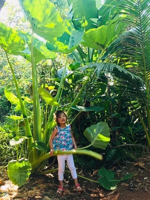 Con gái út của Kiều Trinh tạo dáng bên cây dọc mùng siêu to khổng lồ.