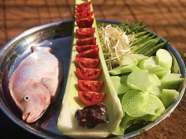 Mâm nguyên liệu nấu canh chua được Kiều Trinh chuẩn bị từ vườn nhà. Nữ diễn viên cũng thường đem cây trái thu hoạch được về thành phố biếu bà con, hàng xóm.
