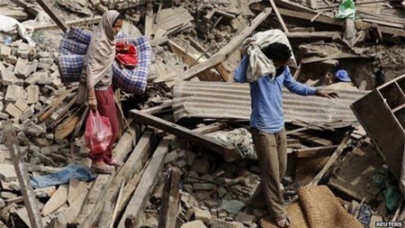 Cư dân ở Bhaktapur - Nepal nhặt nhạnh đồ đạc còn sót lại. Ảnh: Reuters |
