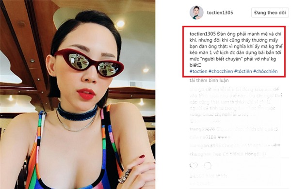 Trên Instagram, Tóc Tiên viết status đầy ẩn ý: "Đàn ông phải mạnh mẽ và chí khí, nhưng đôi khi cũng thấy thương mấy bạn đàn ông thật: Vì nghĩa khí ấy mà không thể kéo màn một vở kịch được dàn dựng bài bảntới mức 'người biết chuyện' phải vờ như không biết".