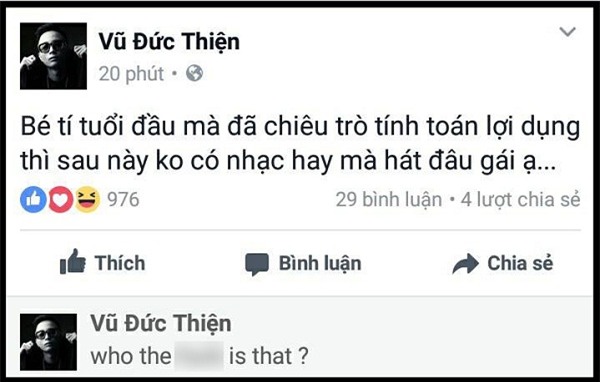 Trong đó, nhạc sĩ Vũ Đức Thiện (Rhymastic) - một thành viên của nhóm Spacespeakers có vẻ rất bức xúc. Anh viết: "Bé tí tuổi đầu mà đã chiêu trò tính toán lợi dụng thì sau này không có nhạc hay mà hát đâu gái ạ".