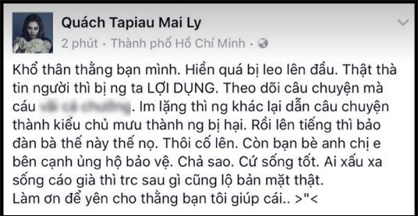 "Khổ thân thằng bạn mình, hiền quá bị leo lên đầu... Im lặng thì người khác lại dẫn câu chuyện thành kiểu chủ mưu thành người bị hại. Rồi lên tiếng thì bảo đàn bà này nọ. Thôi cố lên, cứ sống tốt. Ai xấu xa, sống cáo già thì trước sau gì cũng lộ bản mặt thật", nữ ca sĩ ẩn ý.