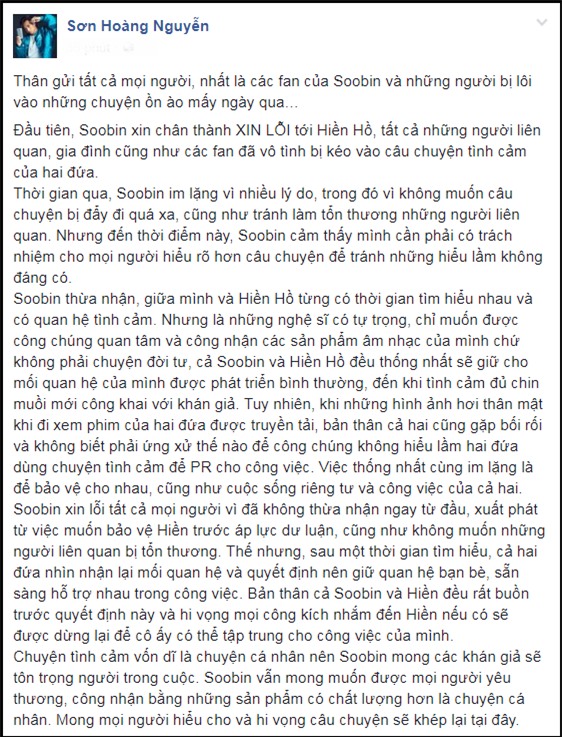 Tâm thư xác nhận chia tay Hiền Hồ của Soobin Hoàng Sơn.